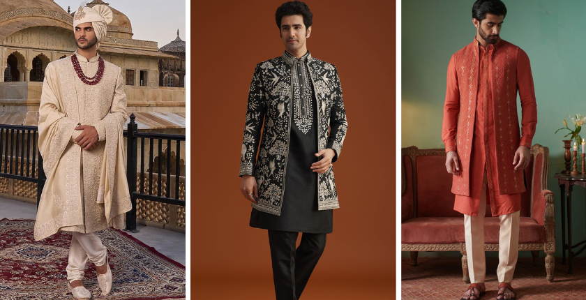 From classic sherwanis to modern Indo-western looks, today’s grooms are spoilt for choice when it comes to wedding fashion. We have selected some unique groom outfit ideas. This outfit options create balance between tradition and chic, making it perfect for every function, along with tips on skincare and accessorizing to look your absolute best.