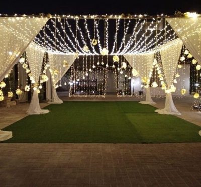 Lighting has the ability to transform mood instantly. A simple lawn can feel enchanted under a canopy of fairy lights. A basic banquet hall can feel intimate with warm amber uplighting. Candle-lit pathways can create a cinematic atmosphere without a single extra flower.