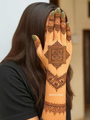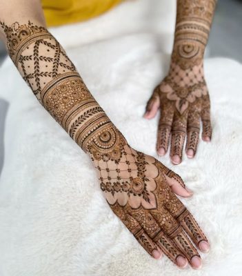 Geometric mehendi designs are perfect for modern brides who prefer contemporary aesthetics. These patterns include straight lines, grids, and symmetrical shapes that create a unique visual effect.
