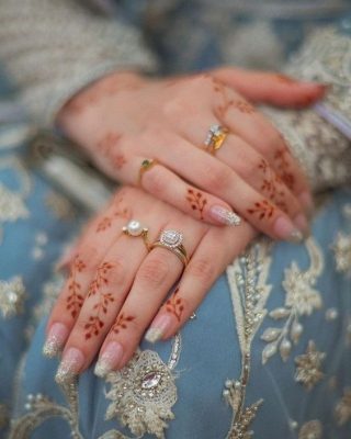 Some mehendi designs are specifically created to highlight the engagement ring. These designs include patterns around the ring finger that draw attention to the ring.