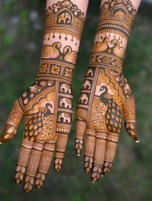 Peacock motifs are one of the most classic elements used in mehendi art. The detailed feathers and curved patterns create a graceful and slightly intricate design.