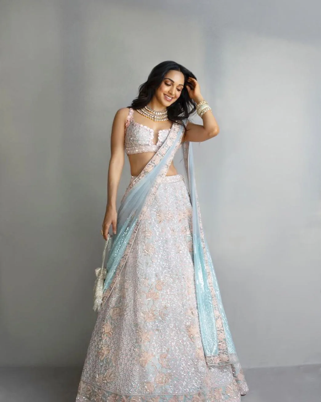 You can pair a red blouse and red dupatta with a floral lehenga skirt. Komal Pandey left us awestruck with this gorgeous ethnic wear. This printed lehenga by Torani is striking