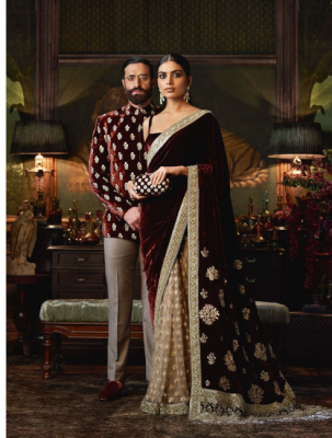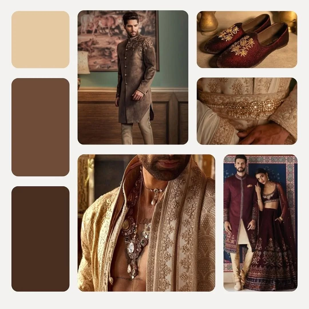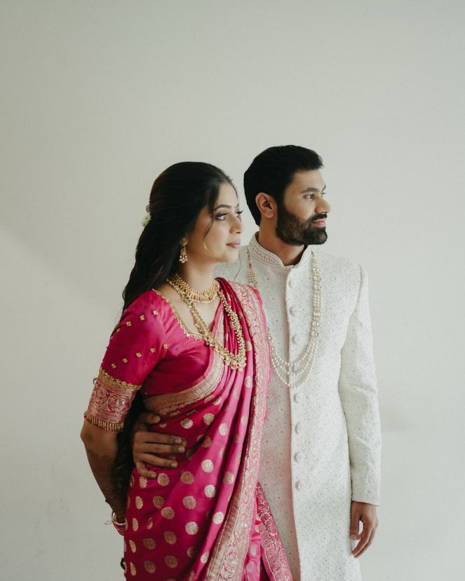 If the bride is wearing silk, the groom should go for a structured sherwani with a rich finish. This keeps the overall look traditional and well-balanced.