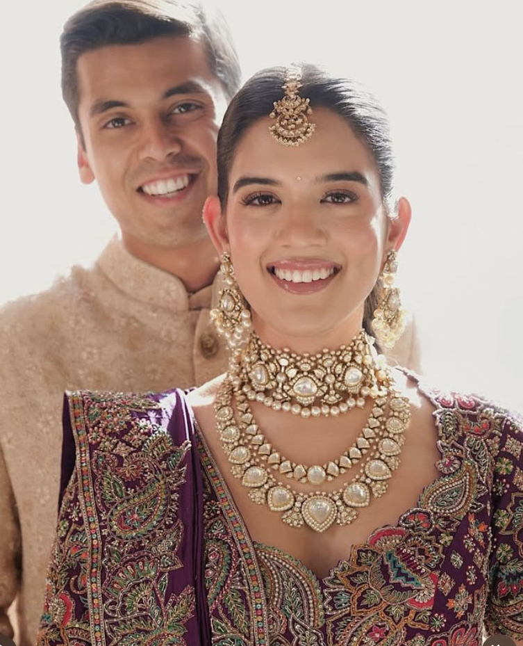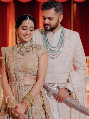 For traditional looks, both bride and groom can include classic tones like kundan or polki to keep the styling consistent.